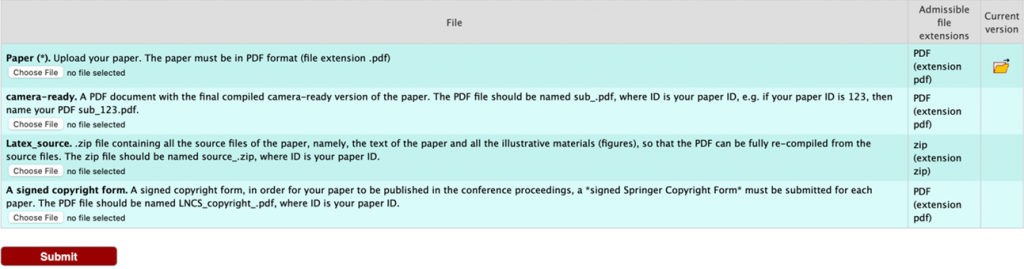 A signed copyright form, for your paper to be published in the conference proceedings, a *signed Springer Copyright Form* must be submitted for each paper. The PDF file should be named LNCS_copyright_ID.pdf, where ID is your paper ID.